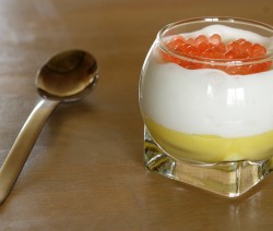 Verrine curd de mangue, mousse coco légère et perles de pamplemousse