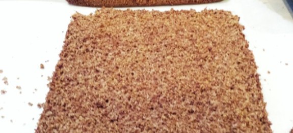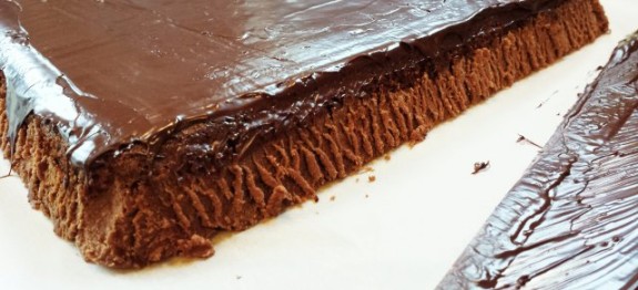 Quand la ganache est cristallisée, décoller les bords et retourner sur une feuille de papier. Décoller la feuille recouvrant le fond du pain d’épices.