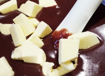 Quand le chocolat atteint la température de 30/35°, ajouter le beurre en petits morceaux et bien mélanger.